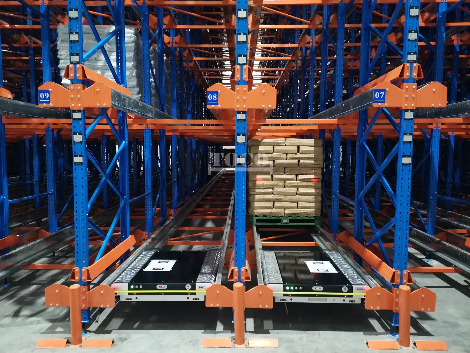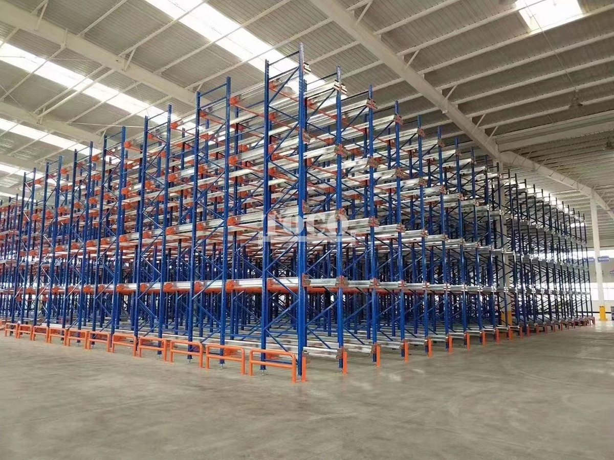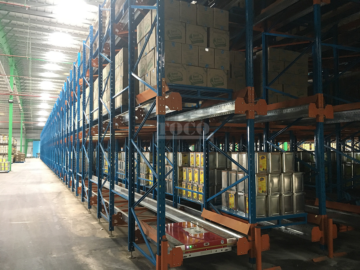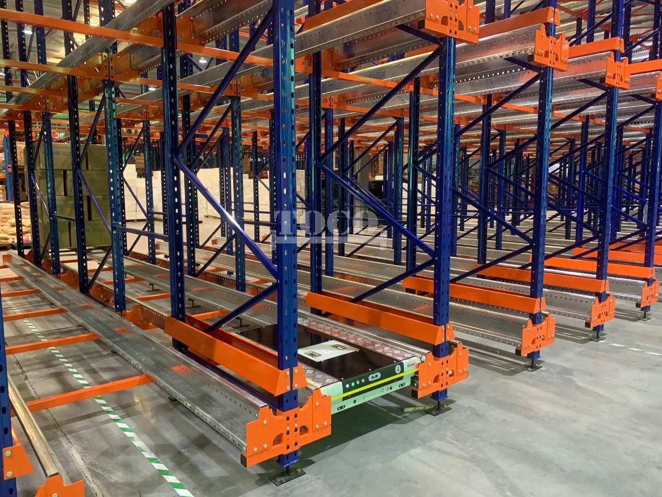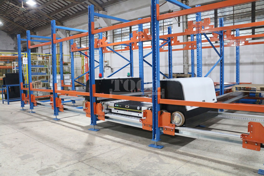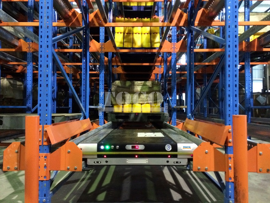 This compact storage system have more pallets in depth than drive in racking, and increase inbound and outbound flows, and more SKUs to be stored. The shuttles can also run in four directions, which forms an fully automated shuttle system coordinated with other equipment.
