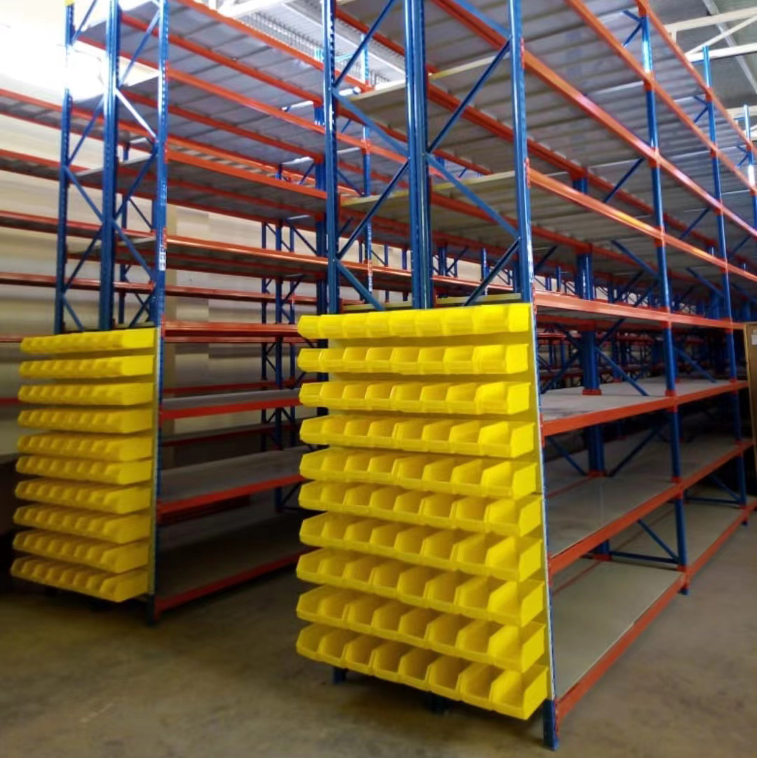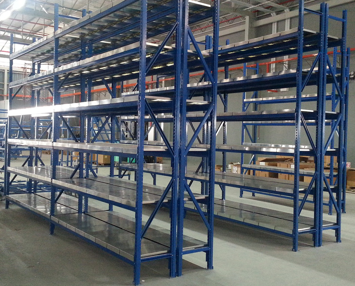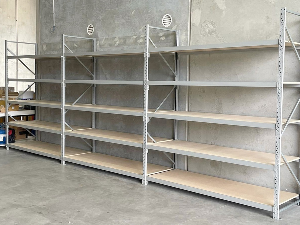 Die Kernstrukturkomponenten des Regals, einschließlich Pfosten (oder Pfosten), horizontale Balken, Regale (Terrassendielen) sowie Aussteifungen und Grundplatten oder Füße. Die Stahlregale werden häufig in Garagen, Werkstätten, Lager- und Industrieanlagen sowie in Großküchen, Einzelhandelsgeschäften und Büros eingesetzt.